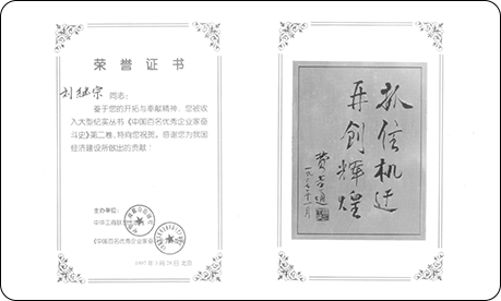 1997年3月,劉繼宗董事長被邀請參加“全國百名優秀企業家大會”,業績被收入大型紀實叢書《中國百名優秀企業家奮斗史》第二卷